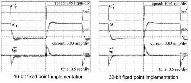 比例積分控制器的積分項總是采用 32 位字長甚至是 16 位定點(diǎn)版本,根據(jù)以往的經(jīng)驗,采用 16 位積分累加的結(jié)果明顯地差的多。采用類似仿真的策略將 ±0.5 pu 的步長應(yīng)用于系統(tǒng)速度參考。d 軸及 q 軸電流和估測速度作為速度命令的步長,這些也證實了仿真結(jié)果。在瞬態(tài)及穩(wěn)態(tài)狀態(tài)下,仿真結(jié)果的響應(yīng)相關(guān)性很強(qiáng)。不良振蕩瞬態(tài)及因采用 16 位實施造成的瞬態(tài)時間增加等情況下的量化效應(yīng)是可以驗證的。