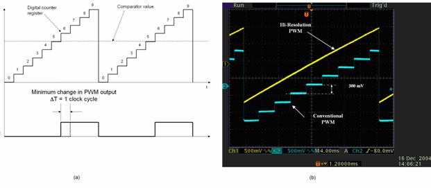 圖3(b) 顯示了運(yùn)行中的高分辨率PWM 及標(biāo)準(zhǔn)PWM 技術(shù)。參考軟件圖形的斜面,當(dāng)禁用高分辨率功能時會產(chǎn)生階梯現(xiàn)象。當(dāng)啟用高分辨率功能時,屏幕上顯示了黃色線跡。很容易看出高分辨率PWM 降低了幾個數(shù)量級的PWM 輸出量化。對于反向器等PWM 驅(qū)動器件而言,由于PWM 的時間分辨率簡單轉(zhuǎn)換為輸出電壓分辨率,高分辨率PWM產(chǎn)生的增強(qiáng)分辨率有助于降低因有限輸出分辨率而導(dǎo)致的有限周期現(xiàn)象的發(fā)生。