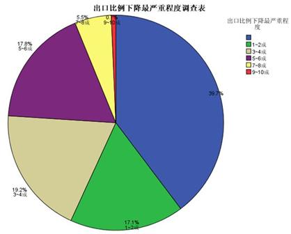 [page](二)出口下降最嚴(yán)重程度5-6成者比重最大,目前為止基本上已大部分恢復(fù)金融風(fēng)暴,全球經(jīng)濟重創(chuàng),對出口為主的企業(yè)影響最為慘重,尤其是對于以出口為導(dǎo)向的我國行業(yè)企業(yè),損失慘重。數(shù)據(jù)顯示,受金融危機影響,出口比例下降最嚴(yán)重程度5-6成者比重最大,占17.8%,下降1-2成者比例也不低,占17.1%(如下圖:出口比例下降最嚴(yán)重程度調(diào)查表。備注:藍(lán)色部分39.7%比例為單一內(nèi)銷型企業(yè))。