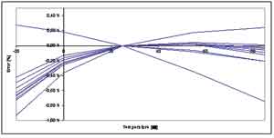 為了在各種溫度變化下獲得更好的性能,愛(ài)特梅爾增加了一個(gè)額外的基準(zhǔn)電壓校準(zhǔn)機(jī)制,用以調(diào)節(jié)帶隙基準(zhǔn)源的溫度系數(shù)。這個(gè)校準(zhǔn)步驟將調(diào)節(jié)曲率的形狀和位置,并顯著改善隨溫度變化的穩(wěn)定性,如圖4所示,在-20~+85℃溫度范圍內(nèi)的最大變化是0.5%。注意第二個(gè)校準(zhǔn)步驟可以檢測(cè)和顯示出具有截然不同的曲線形狀的離群點(diǎn)。