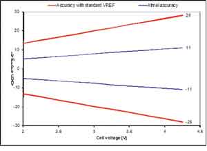 BM器件中常用的標(biāo)準(zhǔn)帶隙基準(zhǔn)源針對(duì)額定變化被校準(zhǔn),在25℃時(shí)的精度極高。然而,曲率形狀和位置變化的補(bǔ)償也相當(dāng)常見(jiàn),這就產(chǎn)生與溫度變化有關(guān)的大幅變化,使得在高和低溫時(shí)電池電壓測(cè)量不夠精確。此外,也不可能檢測(cè)和顯示出曲線形狀顯著不同的離群點(diǎn)。