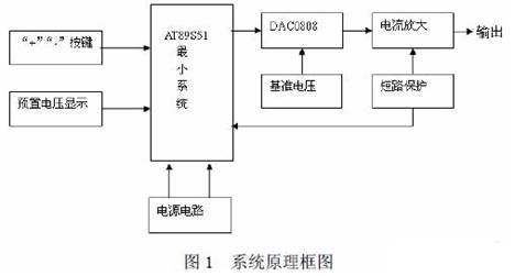 本系統(tǒng)是以AT89S51 單片機(jī)為核心控制器,具有電壓可預(yù)置、可步進(jìn)調(diào)整、輸出的電 壓信號(hào)和預(yù)置的電壓信號(hào)可同時(shí)顯示的數(shù)控直流電源,其硬件原理方框圖如圖1 所示。系統(tǒng) 由AT889S51 控制電路、鍵盤電路、電源電路、D/A 電路、功放電路、短路保護(hù)及報(bào)警電路、 穩(wěn)壓輸出電路、LED 顯示電路八部分組成。系統(tǒng)通過(guò)“開(kāi)關(guān)”、“+”、“-”三個(gè)按鍵來(lái)控制預(yù)置電壓的升降,并通過(guò)數(shù)碼管顯示。AT89S51 單片機(jī)送出相應(yīng)的數(shù)字信號(hào),在D/A 轉(zhuǎn)換之 后輸出電流,經(jīng)集成運(yùn)放LM358 轉(zhuǎn)換、三極管放大、RC 網(wǎng)絡(luò)濾波,最終穩(wěn)定。同時(shí)由LED 數(shù)碼管顯示輸出電壓;由數(shù)字電壓表測(cè)量實(shí)測(cè)值。