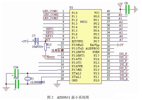 主要由AT89S51 最小系統(tǒng)控制,它要完成鍵盤控制、預(yù)置電壓顯示控制、短路保護(hù)控制 及報(bào)警控制等功能。AT89S51 最小系統(tǒng)如圖2 所示。