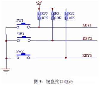鍵盤接口電路如圖3 所示。鍵盤設(shè)計(jì)由三個(gè)按鍵控制即:“開(kāi)關(guān)”鍵、“+”鍵、“-”鍵, 并外接三個(gè)上拉電阻控制鍵盤去抖。此三鍵分別連接到單片機(jī)的P1.0、P1.1、P1.2 接口進(jìn)行控制。