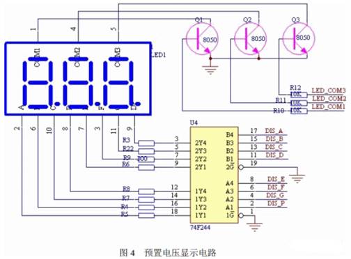 預(yù)置電壓顯示電路如圖4 所示。本設(shè)計(jì)選用譯碼驅(qū)動(dòng)器74F244,用來(lái)驅(qū)動(dòng)LED 數(shù)碼管 顯示預(yù)置電壓,分別由單片機(jī)P2.0~P2.7 接口控制。LED 共陰極控制端由P1.4~P1.6 接口 控制,并用三極管8050 來(lái)控制LED 的顯示。