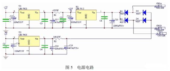 電源部分輸入220V、50Hz 交流電,輸出全機(jī)所需的三種電壓:+5V、+15V、-5V,主要供數(shù)控部分和D/A 轉(zhuǎn)換芯片使用;+15V 作為運(yùn)放的正電源,同時(shí)也是穩(wěn)壓輸出電路的主電源。該電源模塊部分拓展了-5V 負(fù)電壓,同時(shí)作為運(yùn)放的負(fù)電源,如圖5 所示。
