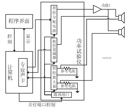 常見的專業(yè)聲卡一般只具備兩個(gè)輸入通道,兩個(gè)輸出通道,而功率試驗(yàn)要求能夠同時(shí)對(duì)多個(gè)通道進(jìn)行測(cè)試,故需要分配電路實(shí)現(xiàn)信號(hào)選擇;此外,專業(yè)聲卡的電壓工作范圍在1至2伏之間,揚(yáng)聲器的實(shí)際工作電壓和工作電流有較大的變化范圍,因此需要進(jìn)行電平變換才能和聲卡連接。綜合這些因素,需要一套獨(dú)立的功率試驗(yàn)儀和聲卡相配合,才能完成測(cè)試功能。功率試驗(yàn)儀內(nèi)部由程控分配電路、程控衰減器、程控放大器、通訊端口、電源電路和接線端子等部分組成。整個(gè)硬件平臺(tái)結(jié)構(gòu)如圖1所示。