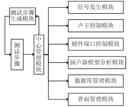 系統(tǒng)軟件采用模塊化設(shè)計(jì)方法,整個(gè)系統(tǒng)包含中心管理模塊、測(cè)試步驟生成模塊、聲卡控制模塊、信號(hào)發(fā)生模塊、揚(yáng)聲器模型分析模塊、硬件端口控制模塊、數(shù)據(jù)庫(kù)管理模塊和界面管理模塊等等。其中中心管理模塊為核心部分,軟件運(yùn)行時(shí)從該模塊進(jìn)入,其它功能模塊均在該模塊的管理下,協(xié)調(diào)一致的工作。各功能模塊均有標(biāo)準(zhǔn)的數(shù)據(jù)接口,統(tǒng)一經(jīng)過中心控制模塊完成數(shù)據(jù)交換,彼此之間不獨(dú)自發(fā)生聯(lián)系,因此可以保證模塊的獨(dú)立性,為程序的維護(hù)和升級(jí)建立了良好基礎(chǔ)。各個(gè)模塊完成的功能如下所述: