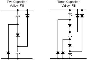 業(yè)界有關(guān)無源(Passive)功率因數(shù)校正(PFC)的方案眾多,這些方案通常都使用較多的額外元器件,其中的一種方案就是谷底填谷(valley-fill)整流器,其中采用的電解電容和二極管組合增大了線路頻率導(dǎo)通角,從而改善功率因數(shù)。實際上,這個過程利用高線路電壓以低電流給串聯(lián)電容充電,然后在較低電壓時以較大電流讓電容放電給開關(guān)穩(wěn)壓器。典型應(yīng)用使用2個電容和3個二極管,而要進一步增強功率因數(shù)性能,則使用3顆電容和6個二極管。