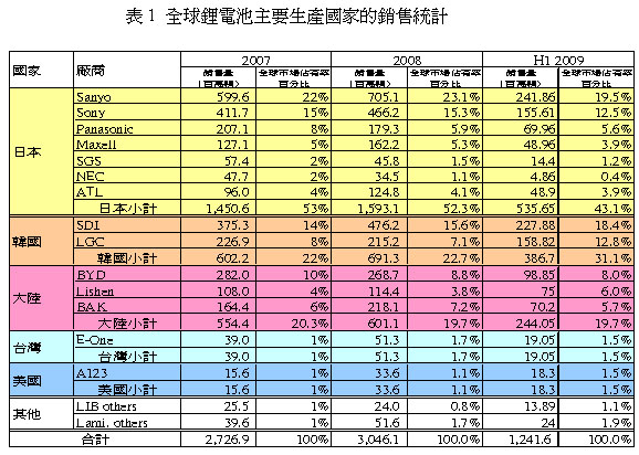 根據(jù)IIT2009年的統(tǒng)計預(yù)估,全球鋰電池芯銷售量約達30.5億顆,主要由日本的Sony、Sanyo、Panansonic、Maxell、SGS、NEC及ATL(被TDK購併),韓國的SDI(三星)及LGC(樂金化學(xué)),大陸的BYD(比亞迪)、BAK(比克)及Lishen(力神),臺灣的E-One(能元)及美國的A123所生產(chǎn),2007年到2009年銷售量統(tǒng)計如表一。