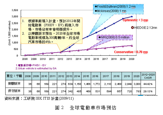 近年來,因應(yīng)氣候變遷及降低石油依賴等考量因素,全球各主要國家積極發(fā)展低污染與低(零)油耗的電動車,促成鋰電池產(chǎn)業(yè)在原有應(yīng)用領(lǐng)域之外的新需求。根據(jù)各國的補助政策及車廠推出的電動車計畫,預(yù)計電動車將在2012年開始進入小規(guī)模量產(chǎn),同時,以較樂觀的成長率推估,預(yù)期在2020年可達到年銷售量300萬量的規(guī)模,未來市場預(yù)估如圖2。