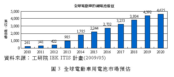 再者,根據(jù)2020年全球電動車年銷售量300萬量的規(guī)模,以70%為PHEV及30%為純電動車(BEV)的電池需求預(yù)估,則2020年全球車用電池的產(chǎn)值為4,625億臺幣如圖3所示。