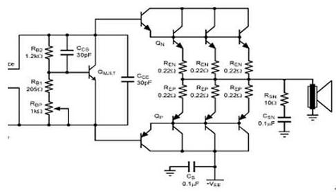改善交越失真的最有效方法便是減少RE的電阻。對(duì)于相同數(shù)值的RE,一個(gè)平行形式的輸出可降低用來改善線性度的整體RE電阻值。同時(shí),假如每一個(gè)級(jí)的RE都較大,那便可為輸出晶體管帶來更佳的匹配性和電流平衡。此外,RE也關(guān)系到輸出的功率損耗。對(duì)于一個(gè)相同的RE,較大的輸出電流會(huì)導(dǎo)致較大的功率損耗。RE的值取決于并聯(lián)輸出晶體管的數(shù)量和揚(yáng)聲器的負(fù)載。建議采用足夠功率的0.1到0.5Ω電阻器。