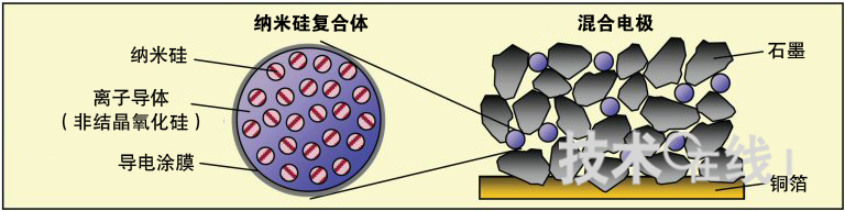 該公司的硅類負極材料的特點是,含有將粒徑僅為nm大小的硅分散于非結(jié)晶SiO(氧化硅)內(nèi)的“納米硅復(fù)合體”(圖1)。而非結(jié)晶SiO可緩和硅的膨脹及縮小程度。實際上是利用碳覆蓋SiO的粒子表面,以提高導(dǎo)電性,然后與原來的負極材料——石墨混合起來利用。