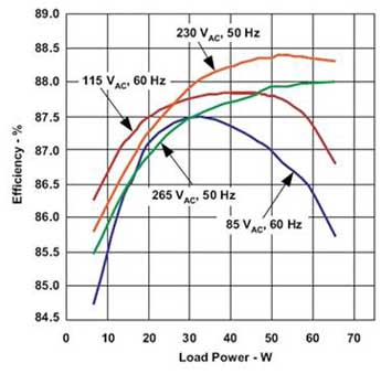 總之,更嚴(yán)格的節(jié)能標(biāo)準(zhǔn)要求創(chuàng)新的電源技術(shù),電源需要在整個負(fù)載范圍內(nèi)都有很高的效率,并可極大節(jié)約能源?;谪?fù)載條件,操作不同模式下的使用準(zhǔn)諧振控制和跳脈沖技術(shù)的反激式變換器可闡明它對AC/DC應(yīng)用中的節(jié)能進(jìn)行優(yōu)化的有效性。新開發(fā)的IC(如TI推出的UCC28600)是符合新節(jié)能標(biāo)準(zhǔn)的最優(yōu)解決方案之一。圖3提供了效率的典型測試結(jié)果,而圖4則顯示了在連接于通用離線輸入(帶單一18Vdc輸出)的65W反激式變換器中使用UCC28600的準(zhǔn)諧振控制和跳脈沖技術(shù)的待機(jī)功率。