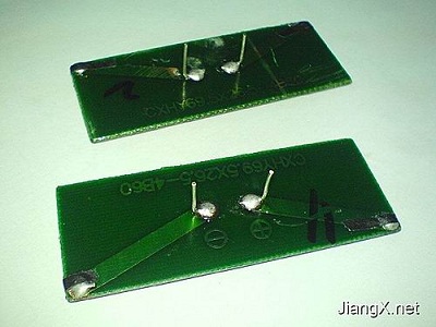 首先剪一小段金屬絲焊接在太陽(yáng)能電池板的兩個(gè)電極上作為引腳(圖3),以便于連接和固定在電路板上。兩塊太陽(yáng)能電池板是正極對(duì)正極,負(fù)極對(duì)負(fù)極(上面有標(biāo)識(shí))并聯(lián)起來(lái)使用的,這樣可以有效地增強(qiáng)太陽(yáng)能電池板提供電流的能力。安裝好太陽(yáng)能電池板后如圖4所示。