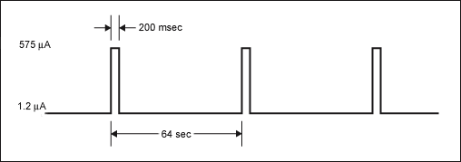 周期性地測量溫度使得器件在短時(shí)間內(nèi)(最差情況下為200ms)的電流損耗增大。圖1給出了DS3231在最差情況下的電流損耗,計(jì)算中假設(shè)電池電壓為3.63V,I²C兼容接口不工作。