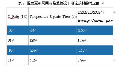 表2列出了DS3232/DS3234溫度更新周期與最差情況下電流損耗的對應(yīng)值。計(jì)算中假設(shè)電池電壓為3.63V,I²C兼容接口不工作。C_Rate位上電時(shí)默認(rèn)為0,對應(yīng)于64s的溫度更新周期。