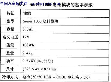 Cobasys是ChevronTexacoTechnologyVenture(美國第二大能源公司)和ECD(EnergyConversionDevices)的合資公司。ECD全資控股Ovonic,Ovonic擁有很多關(guān)于鎳氫電池方面的專利,全世界生產(chǎn)鎳氫電池的企業(yè)須得到它的許可才能生產(chǎn)銷售oCobasys不僅只是技術(shù)的研發(fā),而且把研發(fā)的技術(shù)推廣到產(chǎn)業(yè)化的水平。Cobasys專門為混合動(dòng)力汽車開發(fā)8.8Ah的Series1000電池模塊。其基本參數(shù)見表3。