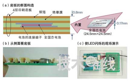 沖Printed Circuits在厚度為0.8mm的4層印刷底板上內(nèi)置了IPS開發(fā)的厚0.17mm的全固態(tài)鋰離子充電電池(a,b)。