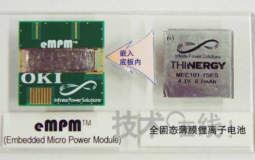不僅是電容器及IC,就連電池也開始內(nèi)置在印刷底板中。沖Printed Circuits試制出了內(nèi)置薄型全固態(tài)鋰離子充電電池的4層印刷底板,并在2010年6月舉辦的安裝技術(shù)國際展會(huì)“JPCA Show 2010”上進(jìn)行了參考展示。“已開始與多家設(shè)備廠商討論使用方法,希望最早于2011年啟動(dòng)業(yè)務(wù)”(沖Printed Circuits技術(shù)本部商品開發(fā)部擔(dān)當(dāng)部長中澤哲夫)。