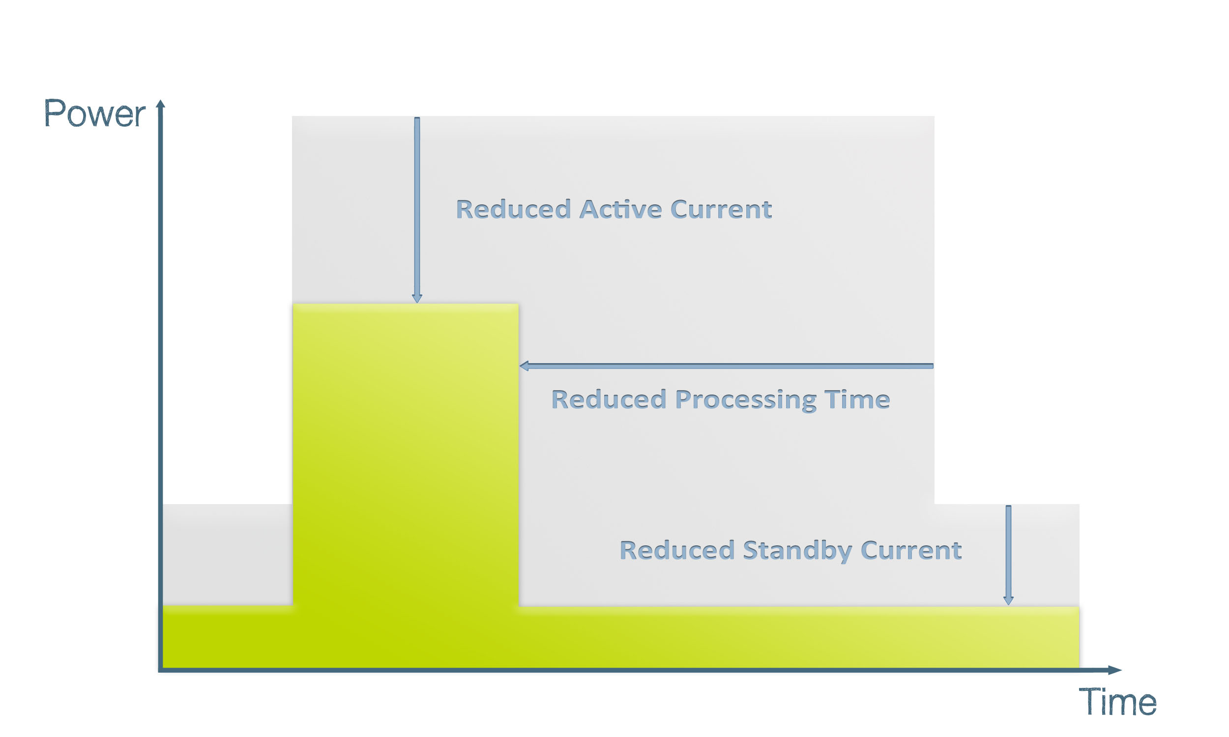 圖1:一個節(jié)能MCU內核可通過完整的喚醒/操作/返回睡眠周期節(jié)省幾個不同區(qū)域的能量。藍色區(qū)域表示一個更強大的32位內核完成任務所節(jié)省的能量,所需的周期比一個8位內核需要的少,在活躍和睡眠模式下消耗的電流也較少。