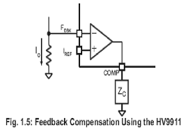 閉回路控制的形成是連接輸出電流信號至FDBKpin,同時將電流參考位準(zhǔn)連接至IREFpin,補(bǔ)償網(wǎng)絡(luò)連接至Comppin(傳導(dǎo)運(yùn)算放大器的輸出端),如圖5所示。放大器的輸出受PWM調(diào)光信號所控制,當(dāng)PWM調(diào)光信號為High時放大器的輸端連接至補(bǔ)償網(wǎng)絡(luò),當(dāng)PWM調(diào)光信號為Low時,放大器的輸出端與補(bǔ)償網(wǎng)絡(luò)被切斷,因此補(bǔ)償網(wǎng)絡(luò)內(nèi)的電容電壓維持住,一直到PWM調(diào)光信號再度回復(fù)High準(zhǔn)位時,補(bǔ)償網(wǎng)絡(luò)才又連接圖放大器的輸出端,這樣可確保電路動作正常以及獲得非常良好的PWM調(diào)光反應(yīng),而不需要設(shè)計一個快速的控制電路。