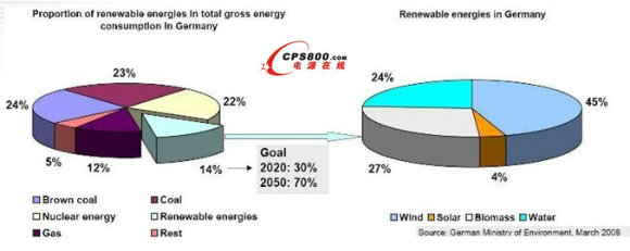 歐洲是現(xiàn)代能源和氣候政策的先驅,德國是利用新能源技術方面一個最好的例證。鑒于到2020年,要實現(xiàn)減少14%的二氧化碳排放量(與2005年的排放量相比)的目標,到2020年可再生能源在初級能源消耗中的比例要增加到18%(2005年為6%)。對于德國總電力消費來說,這意味著到2020年可再生能源的份額將增加一倍,如圖2所示。展望未來,到2050年計劃可再生能源的份額達到70%。
