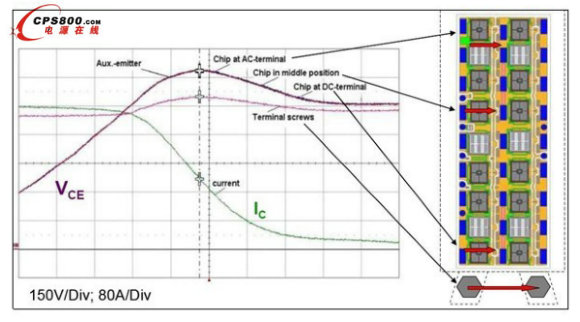 最后一點值得考慮的是新SKiM模塊的內部機械設計。圖6顯示了標有芯片位置的陶瓷襯底的布局。要注意布局的高度對稱性。在右側可以看到同時也扮演機械壓接系統(tǒng)角色的內部功率母線。層狀母線和流經(jīng)每個芯片的電流直接使得DC+和DC端子之間的雜散電感不到20nH。至于IGBT的關斷,對于不同位置的芯片,沒有發(fā)現(xiàn)任何的差別。