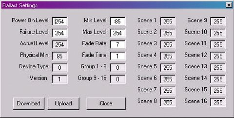當(dāng)程序第一次加載時,“電子鎮(zhèn)流器設(shè)置(Ballastsetting)”窗口將沒有數(shù)據(jù)顯示,要完成一只實際電子鎮(zhèn)流器的設(shè)置,應(yīng)在主界面設(shè)置適應(yīng)的地址,并按下“電子鎮(zhèn)流器設(shè)置(Ballastsetting)”窗口中的“Down/Load”按鈕。