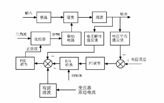 由于在輸出變壓器中,勵(lì)磁電流一般僅占原邊電流的2%,因此原邊電流直流分量的檢測(cè)必須首先濾除勵(lì)磁電流中的基波及高頻成分,然后再將剩下的直流分量放大后用于控制。勵(lì)磁電流中直流分量的提取可先由霍爾電流傳感器檢測(cè)變壓器的原邊電流,再經(jīng)有源濾波,最后送到PID調(diào)節(jié)器中,其雙閉環(huán)控制原理框圖為如圖3所示。