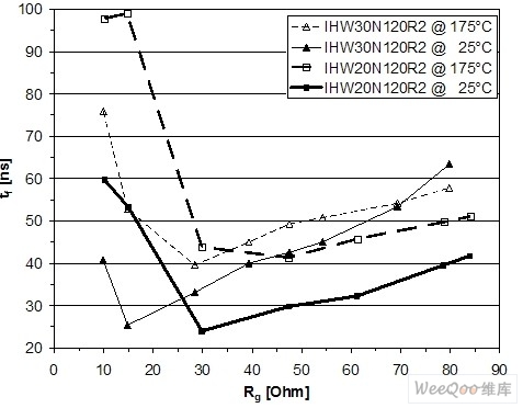 在典型飽和壓降Vce(sat)=1.6V@25℃/1.85V@175℃和典型正向電壓Vf=1.25V@175℃(額定電流)的條件下,功率損(特別是軟開關應用的導通損耗)可大幅度降低。由IHW20N120R2的下降時間的切線可看出高速度—tf=24ns@25℃和Rg=30Ω(44ns@175℃)。IHW30120R2在下降時間方面是最為出色的:tf=33ns@25℃,Rg=30Ω;tf=40ns@175℃。(在硬開關條件下測量,參見帶有Eoff曲線的圖6和圖7)。[page]