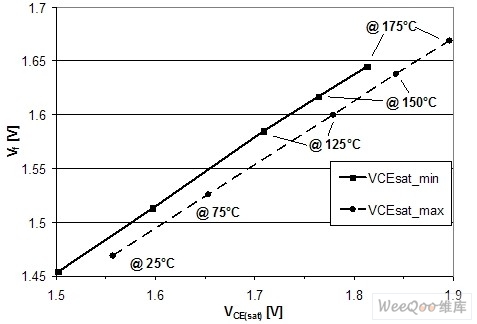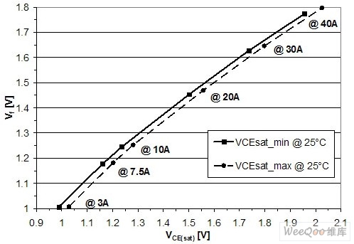 圖8:室溫和不同電流條件下IHW20N120R2的飽和壓降與Vf的關系