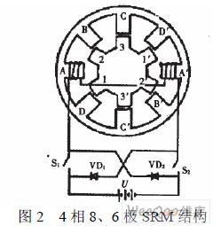 另外,當(dāng)主開關(guān)器件S2導(dǎo)通時,A相繞組從直流電源U吸收電能,而當(dāng)S1、S2關(guān)斷,繞組電流經(jīng)續(xù)流二極管VD1、VD2繼續(xù)流通,并回饋給電源U。此,SR電動機傳動的共性特點是具有再生作用,系統(tǒng)效率高。
