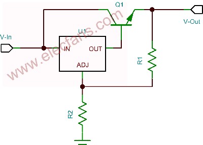 計(jì)算過程中輸入電流的使用,使得穩(wěn)壓器靜態(tài)或接地電流均得到考慮。在要求負(fù)載電流大于穩(wěn)壓器承受能力的情況下,可以添加一個外部晶體管,如圖4所示。這種做法僅適用于可調(diào)輸出穩(wěn)壓器。