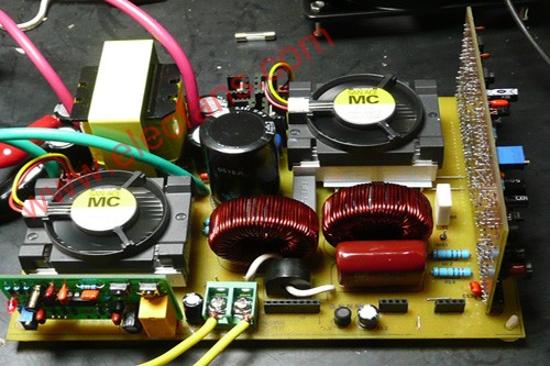 本機(jī)前級(jí)功率管和H橋的功率管都用風(fēng)扇散熱(安裝方法下面再詳述),這是一種小型儀表風(fēng)扇,比電腦上的CPU風(fēng)扇還要小一點(diǎn),實(shí)驗(yàn)證明,在600W輸出的情況下,H橋的4個(gè)功率管散熱不成問(wèn)題,但前級(jí)的二個(gè)功率管好象散熱不夠一點(diǎn),如果有可能,最好用大一點(diǎn)的風(fēng)扇。