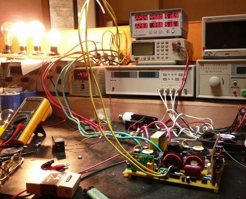 這里,可以稍稍為前級(jí)加點(diǎn)負(fù)載,可以用二個(gè)100W220V的燈泡串聯(lián)起來(lái),接到高壓解的二端,這時(shí)電瓶電流可達(dá)到12A左右,讓它工作一段時(shí)間,看看前級(jí)功率管有沒(méi)有溫升,如果溫升不明顯,可以把電瓶保險(xiǎn)絲換大點(diǎn),繼續(xù)加大負(fù)載,一般在功率管散熱正常的情況下,前級(jí)可以加到600W左右。在加載的情況下,再看D極波形,應(yīng)該是正常的方波,稍有點(diǎn)尖峰是沒(méi)有關(guān)系的,如果尖峰過(guò)大,說(shuō)明變壓器制作不過(guò)關(guān),要重新繞制。