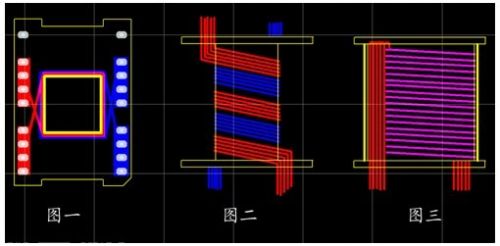 先用5根0.93線(xiàn)繞2圈(見(jiàn)圖二中紅線(xiàn)),中間留空隙,再在空隙處用另外5根線(xiàn)繞2圈(見(jiàn)圖二中藍(lán)線(xiàn)),每根線(xiàn)長(zhǎng)約37CM。用同樣的方法繞二層,層間包二層膠帶,這樣就相當(dāng)于用了10根線(xiàn)并繞。繞完低壓繞組,在繞組外用高溫膠帶包三層。繞低壓繞組要注意的問(wèn)題是:線(xiàn)頭留在下面,即骨架引腳處,線(xiàn)尾留長(zhǎng)一點(diǎn),暫時(shí)留在骨架的上面(等繞完高壓繞組后要向下折下來(lái))。從(圖一)可以看出,實(shí)際上,低壓繞組的頭和尾是有一段是重疊的,也就是不是2圈,而是約2.2圈,這樣做可以大大減少漏感。