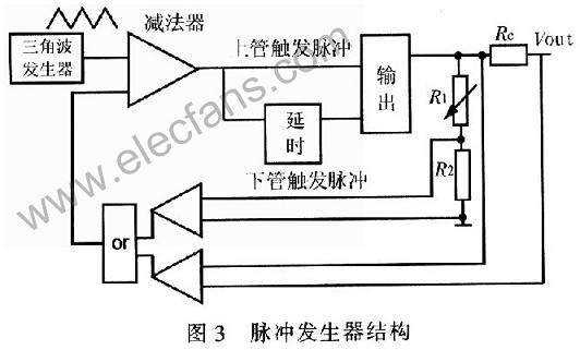 系統(tǒng)采用了電流負(fù)反饋電路,以適應(yīng)激光二極管的要求。當(dāng)負(fù)載變化,電流略大于給定電流時,減小ton寬度,電壓降低。電流略小于給定電流時,增加ton寬度,這樣可以維持電流穩(wěn)定。圖3所示為脈沖發(fā)生器結(jié)構(gòu)。