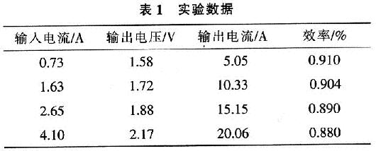 實驗中用50A的2個二極管串聯(lián)作為負(fù)載,輸入電壓12V時,不同電流下輸出及效率如表1所示。