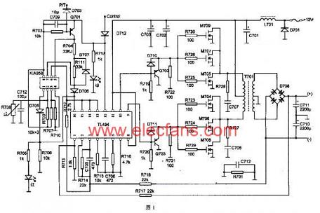 圖1為汽車音響開關(guān)電源電路,該電路主要由兩片集成電路TL494和KIA358、驅(qū)動(dòng)管Q702和Q703、開關(guān)管M704~M709、變壓器、輸出整流器和濾波器等組成。TL494是一個(gè)脈寬調(diào)制型開關(guān)電源集成控制器,其最大驅(qū)動(dòng)電流為250mA,工作頻率為1~300kHz,輸出方式可選推挽或單端形式。內(nèi)部方框圖如圖2所示,詳細(xì)資料參考TL494脈寬調(diào)制控制電路。它主要由一個(gè)三角波振蕩器、兩個(gè)比較器CMP1和CMP2、兩個(gè)誤差放大器A1和A2、5V基準(zhǔn)電壓源、觸發(fā)器及輸出驅(qū)動(dòng)器等組成。