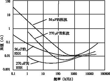 這兩個(gè)系列電容器的典型特性曲線如圖3、圖4及圖5所示。圖3是56μF(ESRD系列)及270μF(ESRE系列)在不同頻率時(shí)的阻抗值及ESR值。在100kHz~1MHz時(shí),其阻抗及ESR值都很小,并且可以看出即使是56μF的電容量,在1MHz時(shí),其ESR值與270μF的值相差并不多。