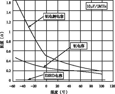 圖4是三種不同的10μF電容器在溫度變化時(shí)的阻抗變化情況,可以從圖4中看出鋁電解電容器在負(fù)溫時(shí)阻抗變化較大,鉭電容性能較好,而ESRD電容在-55℃~+105℃的溫度范圍內(nèi)阻抗幾乎不變,而且三種電容中ESRD型電容器的阻抗最小。