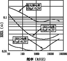 圖5是在不同頻率下100μF的鉭電容、10μF及47μF的ESRD電容的ESR值的變化情況。由圖可以看出,在1MHz時(shí),10μF的ESRD電容的ESR值約為0.012Ω,而100μF的鉭電容在1MHz時(shí)約為0.016Ω,二者的容量差10倍,這說明ESRD電容具有良好的高頻性能。