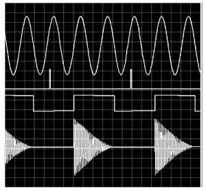 各信號(hào)波形的時(shí)序:在交流電正半周的過(guò)0點(diǎn)觸發(fā)SCR1,用于C1的充電;在下個(gè)周期正半周的過(guò)0點(diǎn)觸發(fā)SCR2,用于形成并聯(lián)諧振回路。SCR2的觸發(fā)信號(hào)不能用窄脈沖信號(hào),而是采用電平觸發(fā)方式,這樣,當(dāng)電感電壓超過(guò)電容電壓時(shí),盡管SCR2自動(dòng)截止,但是在下一次電容給電感充電時(shí),控制端滿(mǎn)足導(dǎo)通的條件,SCR2仍然能導(dǎo)通,進(jìn)行連續(xù)充放電。