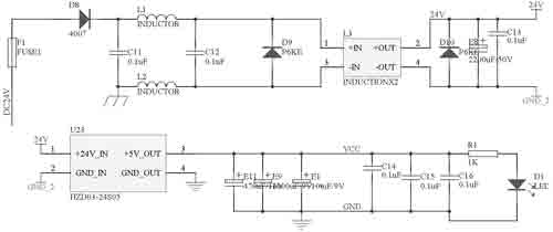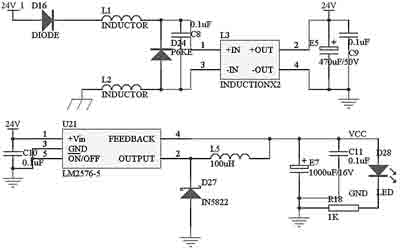 本控制模塊的電源電路如圖2所示。車載蓄電池—發(fā)電機的電源從24V_1處進入,二極管D16主要是防止電源的正負極被誤接反。電感L1、L2對電源進行濾波,和共模電感L3、電容C8配合,可以過濾掉電源中的尖峰脈沖。二極管D24P6KE51A是脈沖干擾抑制器(TVS),它可以快速吸收超過額定電壓的尖峰脈沖,瞬時通過電流很大,最大功率可達500~1000W。電容E5和C9進一步對電源進行濾波。過濾干凈的電流通過開關(guān)電源芯片LM2576變換為系統(tǒng)使用的5V電源。電容E7和C11對輸出5V電源進行濾波,電阻R18和發(fā)光二極管D28指示當前是否有電。
