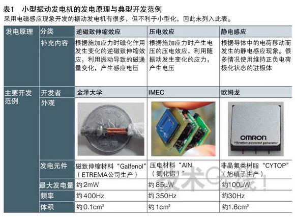 日本金澤大學(xué)上野敏幸副教授開(kāi)發(fā)出了尺寸雖小卻可獲得較大發(fā)電量的振動(dòng)發(fā)電機(jī)。盡管外形尺寸僅為約2mm×3mm×12mm,但振動(dòng)頻率達(dá)到約400Hz時(shí)卻可獲得約2mW的發(fā)電量(表1)。