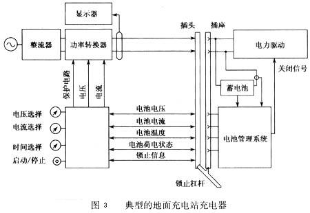 圖3為一典型的地面充電站中充電器的方案,該充電器由一個(gè)能將輸人的交流電轉(zhuǎn)換為直流電的整流器和一個(gè)能調(diào)節(jié)直流電功率的功率轉(zhuǎn)換器組成,通過把帶電線的插頭插入電動(dòng)汽車上配套的插座中,直流電能就輸入蓄電池對(duì)其充電。充電器設(shè)置了一個(gè)鎖止杠桿以利于插入和取出插頭,同時(shí)杠桿還能提供一個(gè)確定已經(jīng)鎖緊的信號(hào)以確保安全。根據(jù)充電器和車上電池管理系統(tǒng)相互之間的通訊,功率轉(zhuǎn)換器能在線調(diào)節(jié)直流充電功率,而且充電器能顯示充電電壓、充電電流、充電量和充電費(fèi)用等。