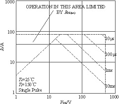 檢測(cè)電纜絕緣中,通常需要的直流電壓為50V,這樣,設(shè)定中性點(diǎn)的接地電阻最小值為5Ω,通過(guò)歐姆定律我們可以得出,直流電源至少要能夠提供10A的電流;此外,考慮到在測(cè)量過(guò)程中需要的開(kāi)關(guān)速度,就可以選擇合適的電力電子器件了。經(jīng)過(guò)對(duì)常用全控型電力電子器件的考察,我們決定采用MOSFET來(lái)作為開(kāi)關(guān)器件,選用IR公司的IRFP460。IRFP460是IR公司生產(chǎn)的高速器件,它的安全工作區(qū)如圖2所示,在圖2中我們可以看出,在50V的情況下,10A是它可以安全關(guān)斷的電流[3]。