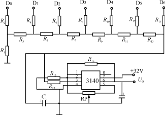 這需要將計(jì)數(shù)器的二進(jìn)制數(shù)轉(zhuǎn)化為電壓。顯然用D/A轉(zhuǎn)換是可以的,但電路復(fù)雜程度上升,成本也有所提高。故為了簡(jiǎn)化電路我們僅借用D/A轉(zhuǎn)換網(wǎng)絡(luò)的思想,利用權(quán)電阻T形網(wǎng)絡(luò)將4516的7位數(shù)值變換成模擬量輸出,推動(dòng)電壓表指示,見(jiàn)圖5。